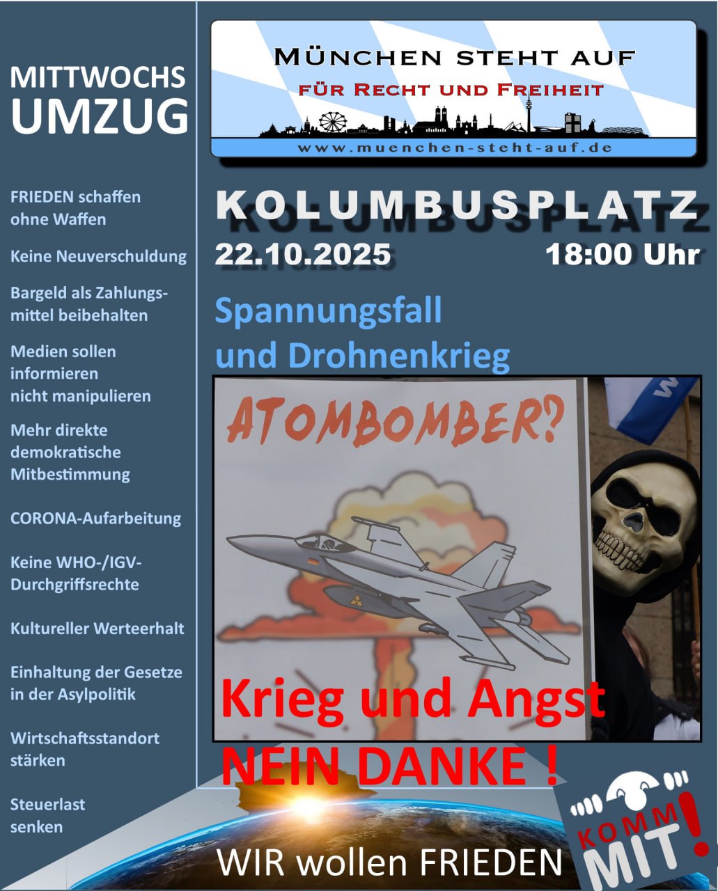 22Okt18:00Mittwochs-Umzug "München steht auf"18:00 München, Kolumbusplatz