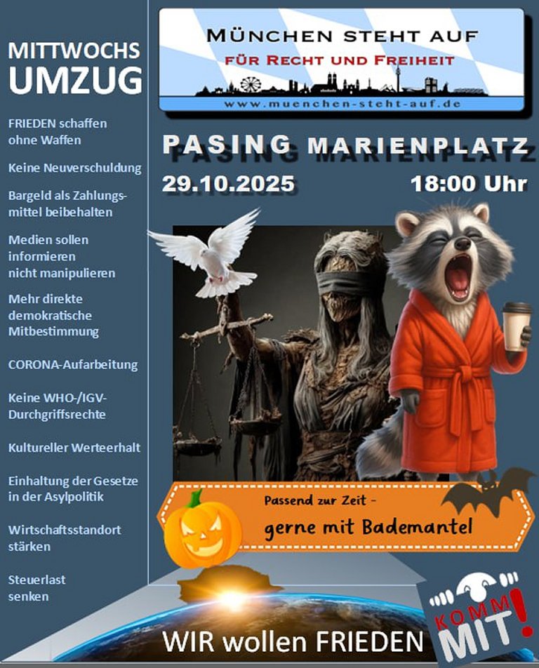29Okt18:00Mittwochs-Umzug "München steht auf"18:00 München Pasing, Marienplatz